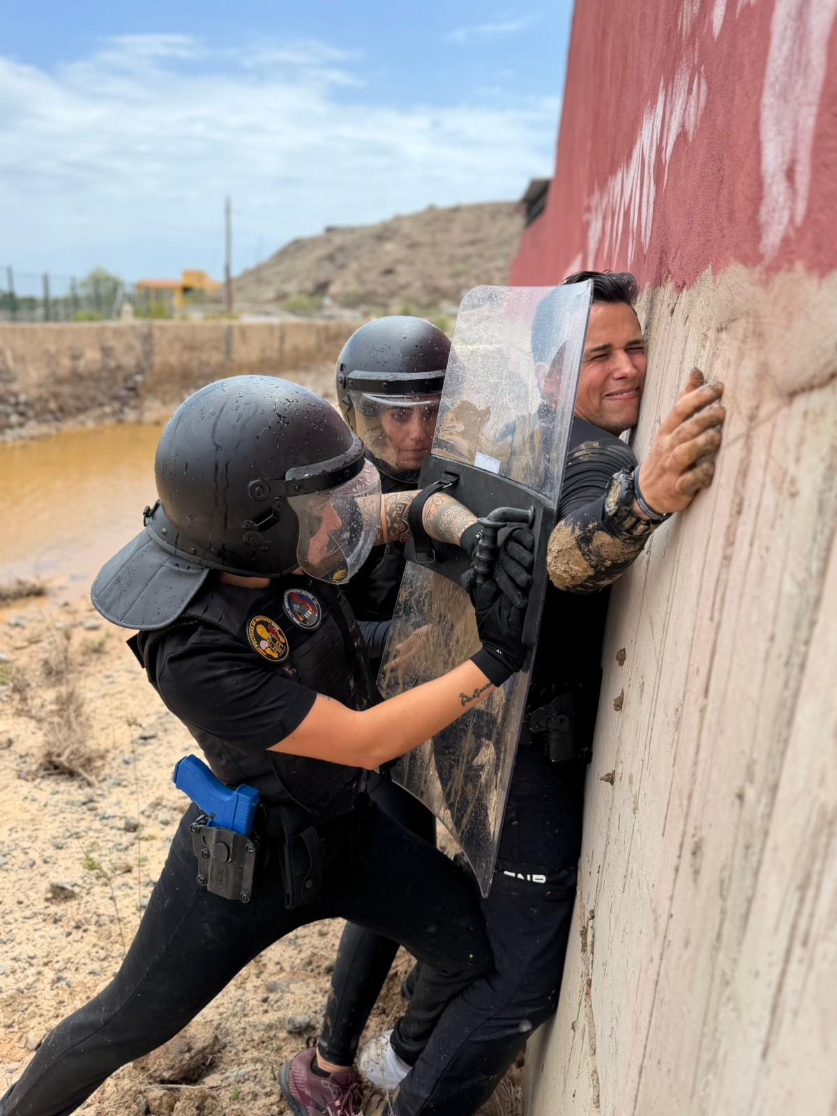 Aquí no se entrena en un aula. Se entrena en barro, en agua, en escenarios de tensión, en situaciones que simulan conflictos reales de antidisturbios. El objetivo es claro: que quien entre en ese espacio no solo aprenda, sino que experimente lo que significa actuar bajo presión.